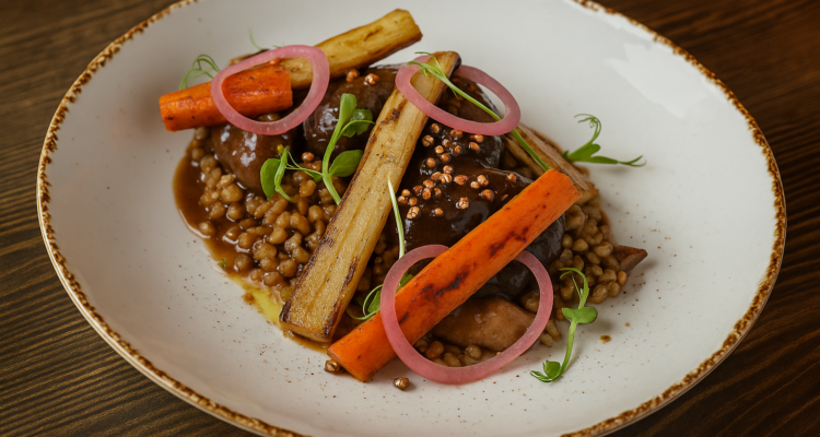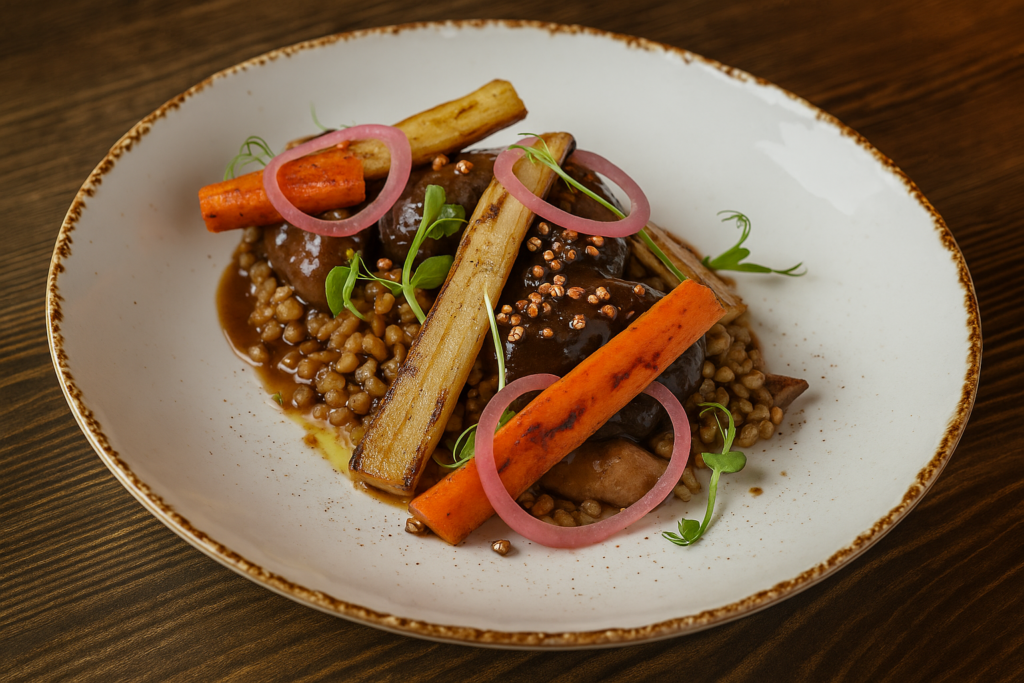 – Żołądki gęsie duszone w czerwonym winie, z grzybowym pęczotto,