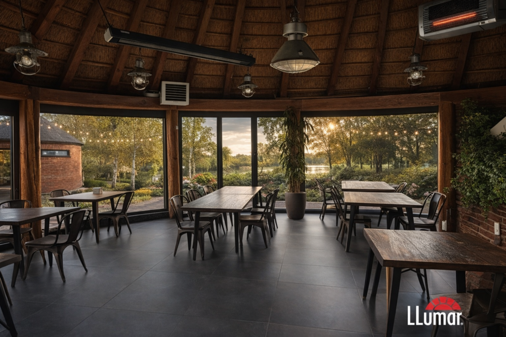 Inwestycja obejmowała zastosowanie zewnętrznej folii architektonicznej klasy premium LLumar NHE 1035 ER HPR, przeznaczonej do kontroli energii słonecznej oraz poprawy komfortu użytkowania przestrzeni.